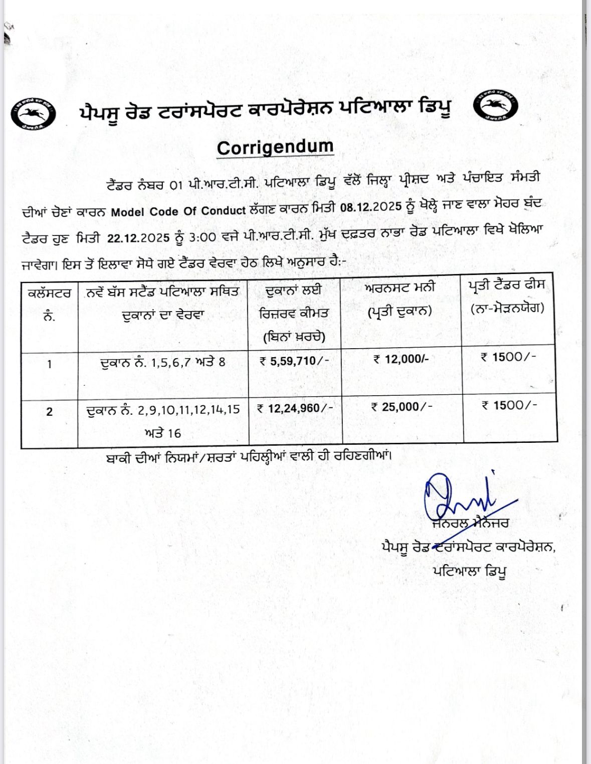 | Corrigendum regarding ਪੀ.ਆਰ.ਟੀ.ਸੀ ਪਟਿਆਲਾ ਡਿਪੂ ਅਧੀਨ ਆਉਦੇ ਬੱਸ ਸਟੈਂਡ ਤੇ ਸਥਿਤ ਦੁਕਾਨਾਂ ਨੂੰ ਟੈਂਡਰ ਰਾਹੀ ਲਾਇਸੰਸੰ ਅਧਾਰ ਤੇ ਦੇਣ ਸਬੰਧੀ | view download |